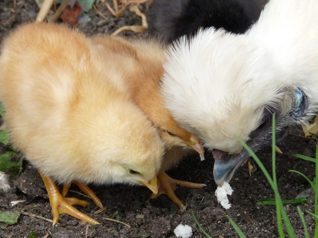 | If you have ever held a new chick, you'll know it's just a ball of down on legs. These chicks' mother, Henrietta, has her own ball of down as a hat - we call it her pom-pom |